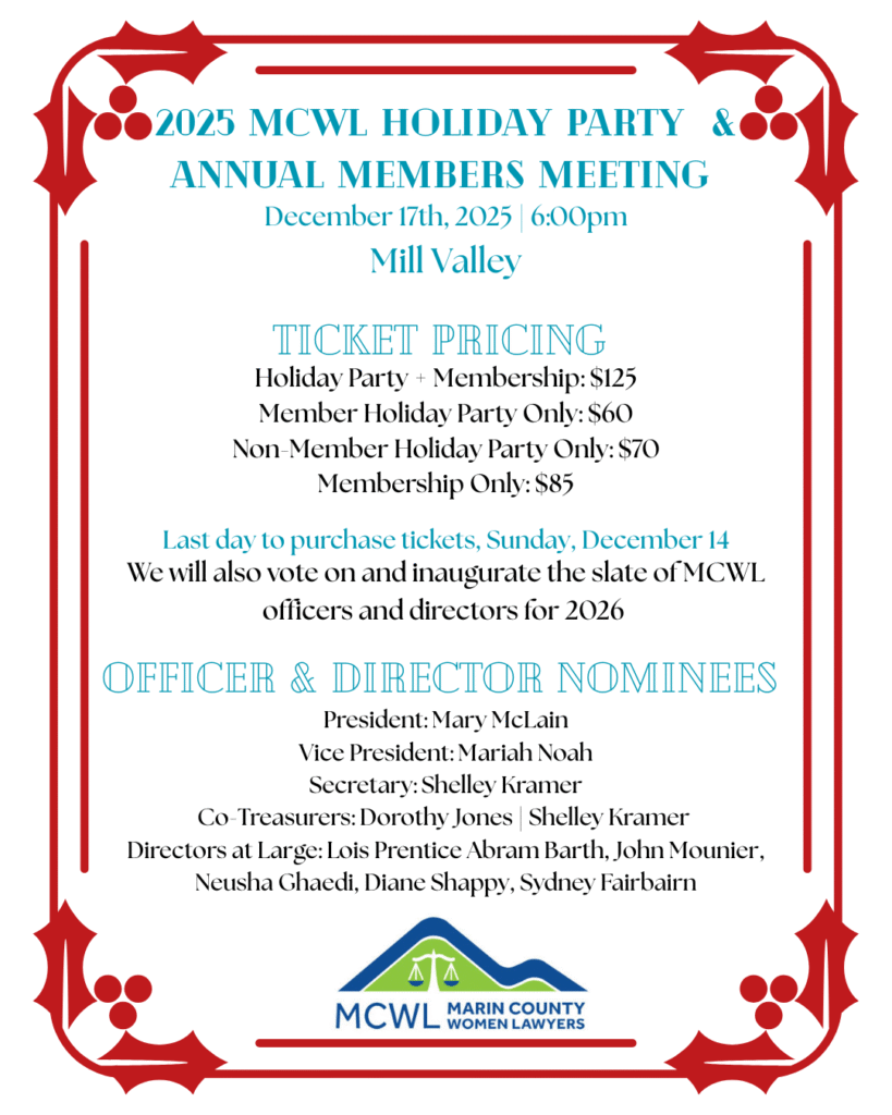 MCWL is delighted to announce this years Holiday Party & Annual Member Meeting, an evening filled with connection, great food, and festive drinks. This celebration will also serve as our inaugural Members Meeting, during which we will vote on the 2026 slate of MCWL officers and directors. The event will be hosted at a private home in Mill Valley with the address provided after registration, by December 15th.