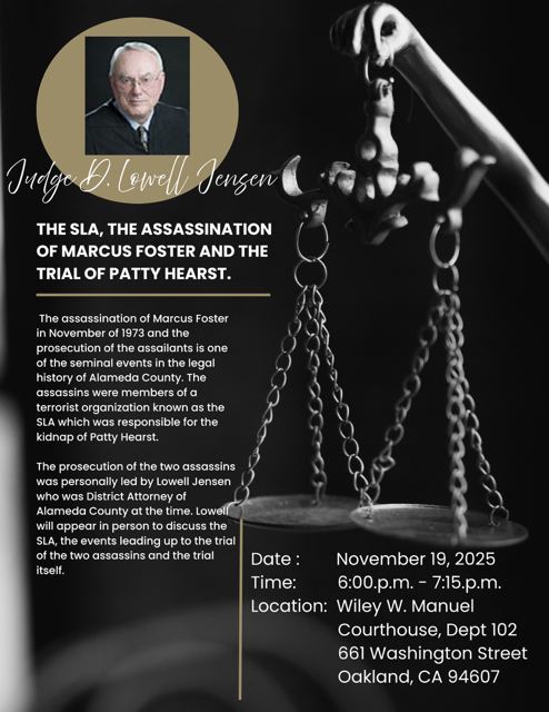 A distinguished member of the Earl Warren Inn of Court, D. Lowell Jensen, was the Alameda County District Attorney at the time and was the prosecutor in one of the major trials that arose from those events. Judge Jensen will be the anchor of the program, recounting his unparalleled perspective from inside one of the most unique and shocking sagas in both the news and legal world. These events occurred 50 years ago, and yet his memory of the courtroom aspects of these events is impeccable.